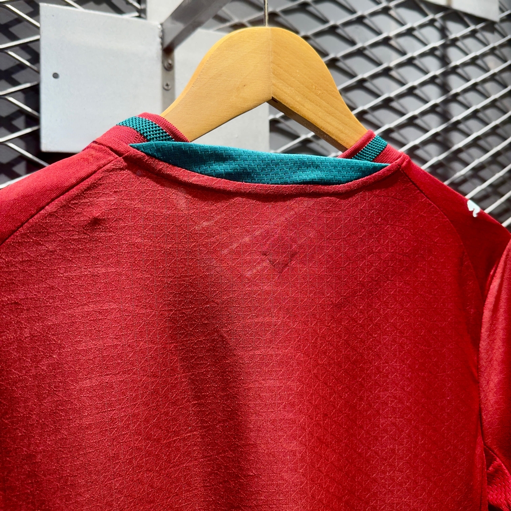 Mẫu áo của Bồ Đào Nha tại World Cup 2026 nổi bật với các họa tiết sọc ngang chìm trên áo được lấy cảm hứng từ sóng biển, những cơn sóng đã đưa tiền nhân trước đây của đất nước ra khơi khám phá thế giới rộng lớn.