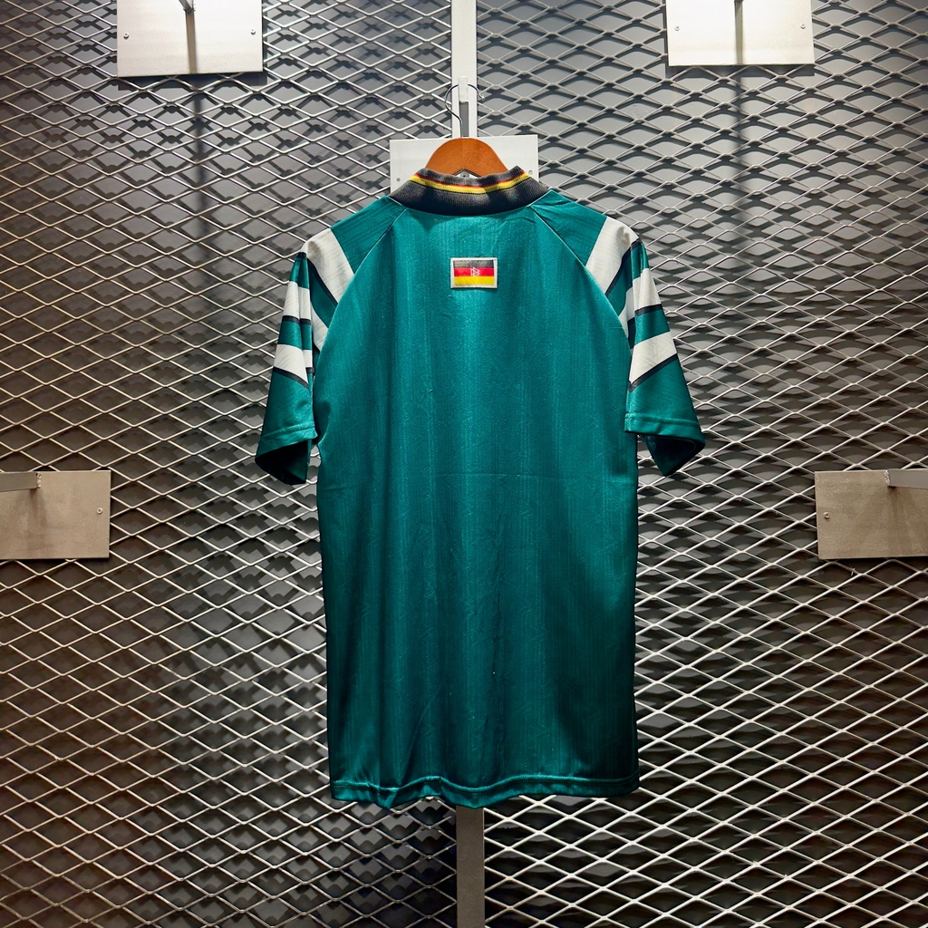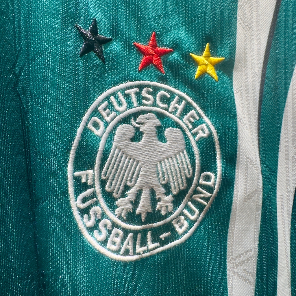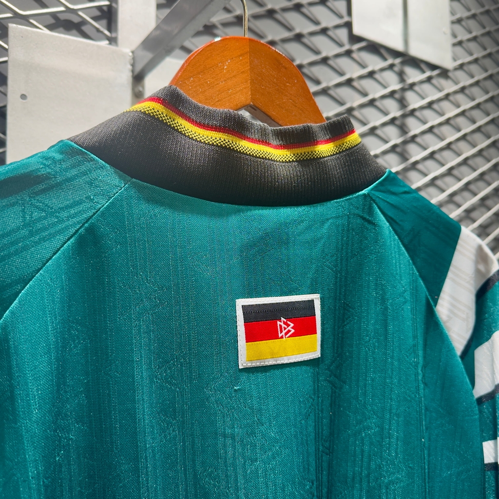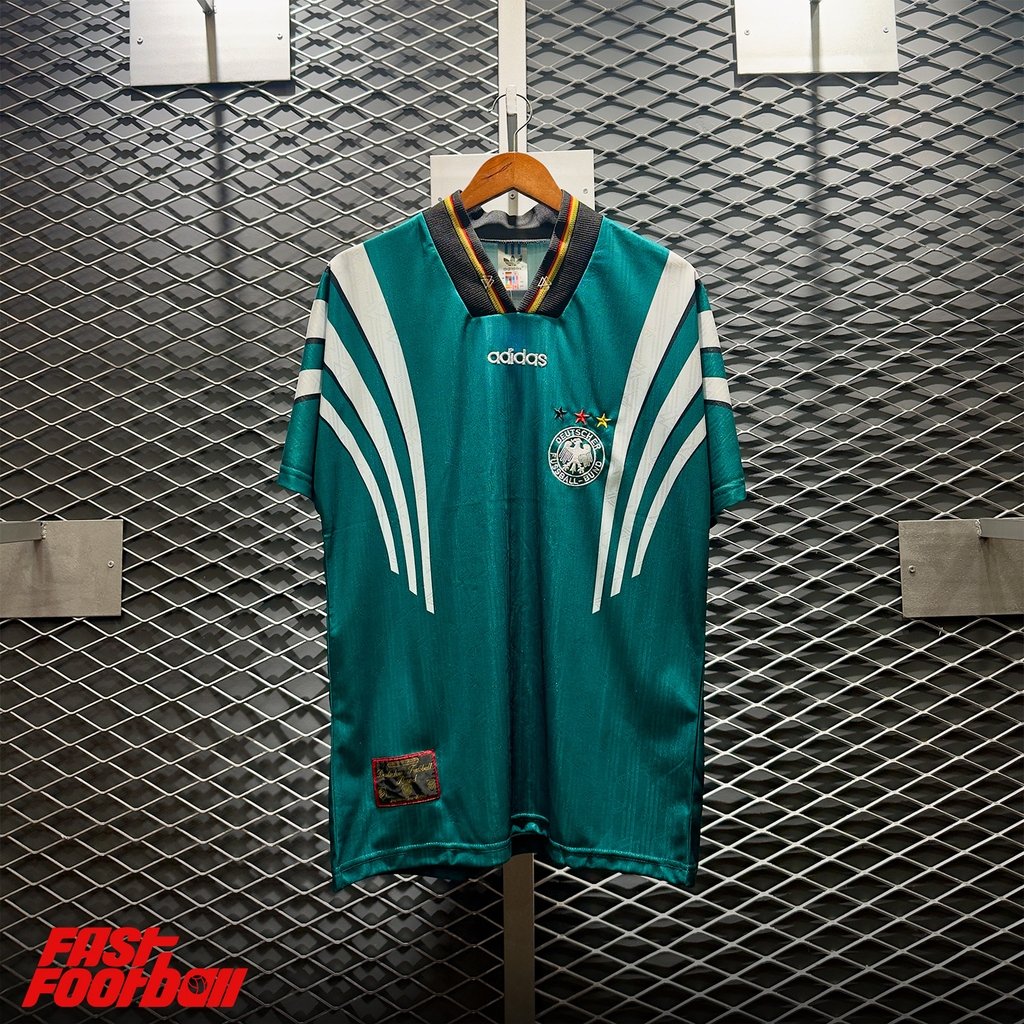 Vào thập niên 80 và 90 thế kỷ trước, màu xanh lá luôn là màu chủ đạo trên các thiết kế sân khách của đội tuyển Đức. Mẫu áo sân khách tại kỳ Euro 1996 cũng là một trong những thiết kế màu xanh lá ấn tượng nhất của Cỗ Xe Tăng. Những họa tiết sọc phá cách không chỉ là biểu tượng của Adidas mà còn khắc họa đôi cánh chim đại bàng Bundesadler trong logo. Ngoài ra ba màu truyền thống của quốc kỳ tô điểm lên ba ngôi sao tượng trưng cho ba chức vô địch thế giới của đội tuyển Đức cũng là một chi tiết ấn tượng.