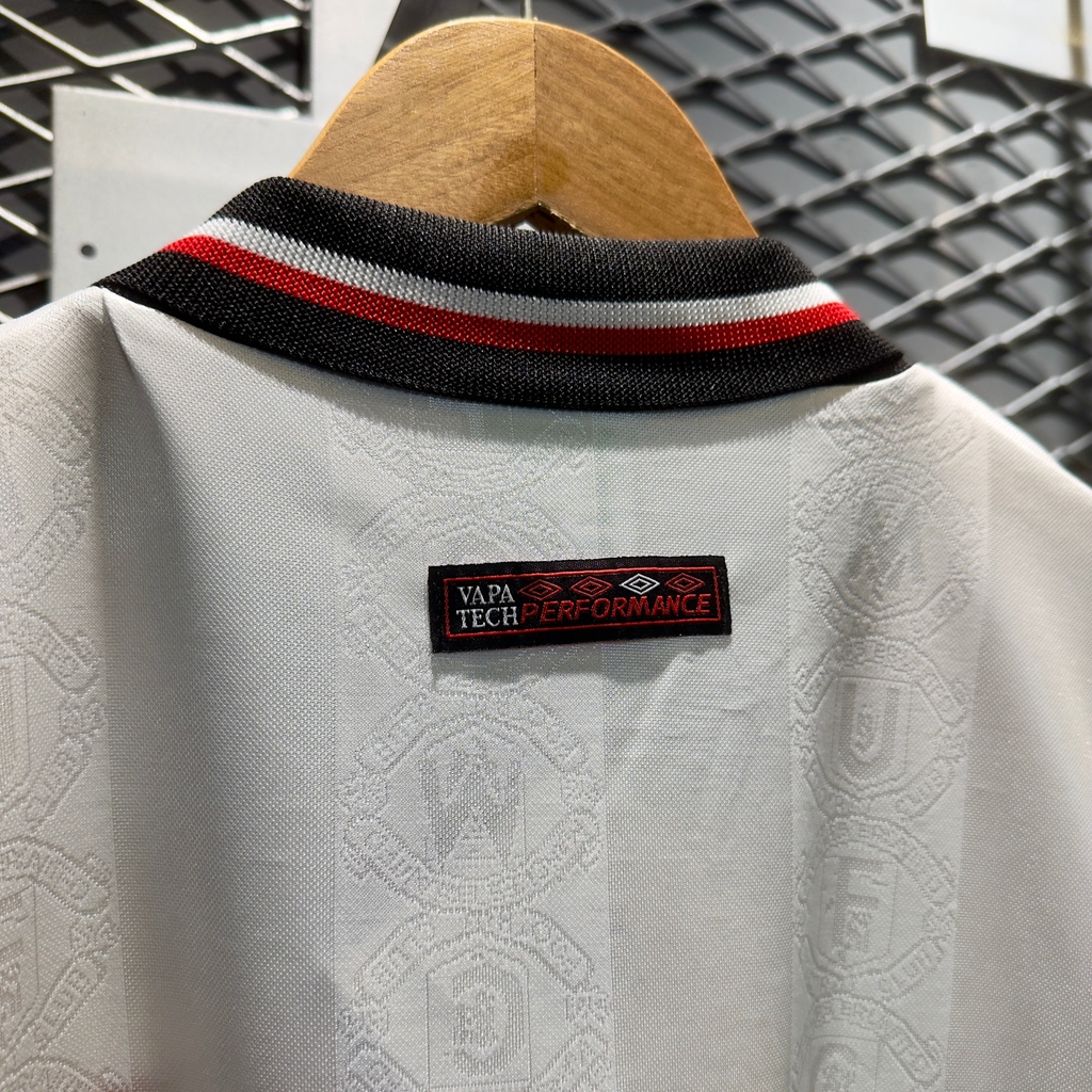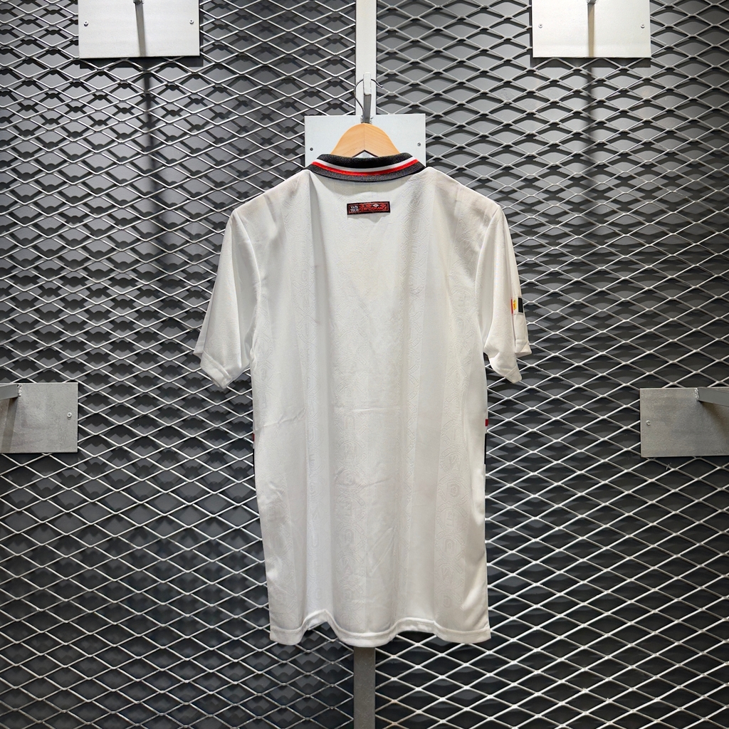 Nói về mùa giải huyền thoại 1998/99 của Manchester United thì không chỉ có cú ăn ba danh hiệu thần thánh hay đội hình trong mơ mà còn phải nhắc đến những thiết kế áo đấu tuyệt đẹp. Mẫu sân khách đã gây ấn tượng mạnh khi phối hợp hài hòa ba màu trắng, đen và đỏ - bộ ba màu sắc đại diện cho hội cổ động viên của MU. Ngoài ra, chi tiết logo nằm trong tấm khiên còn thể hiện tinh thần chiến đấu bất khuất của đoàn quân thầy Alex Ferguson.